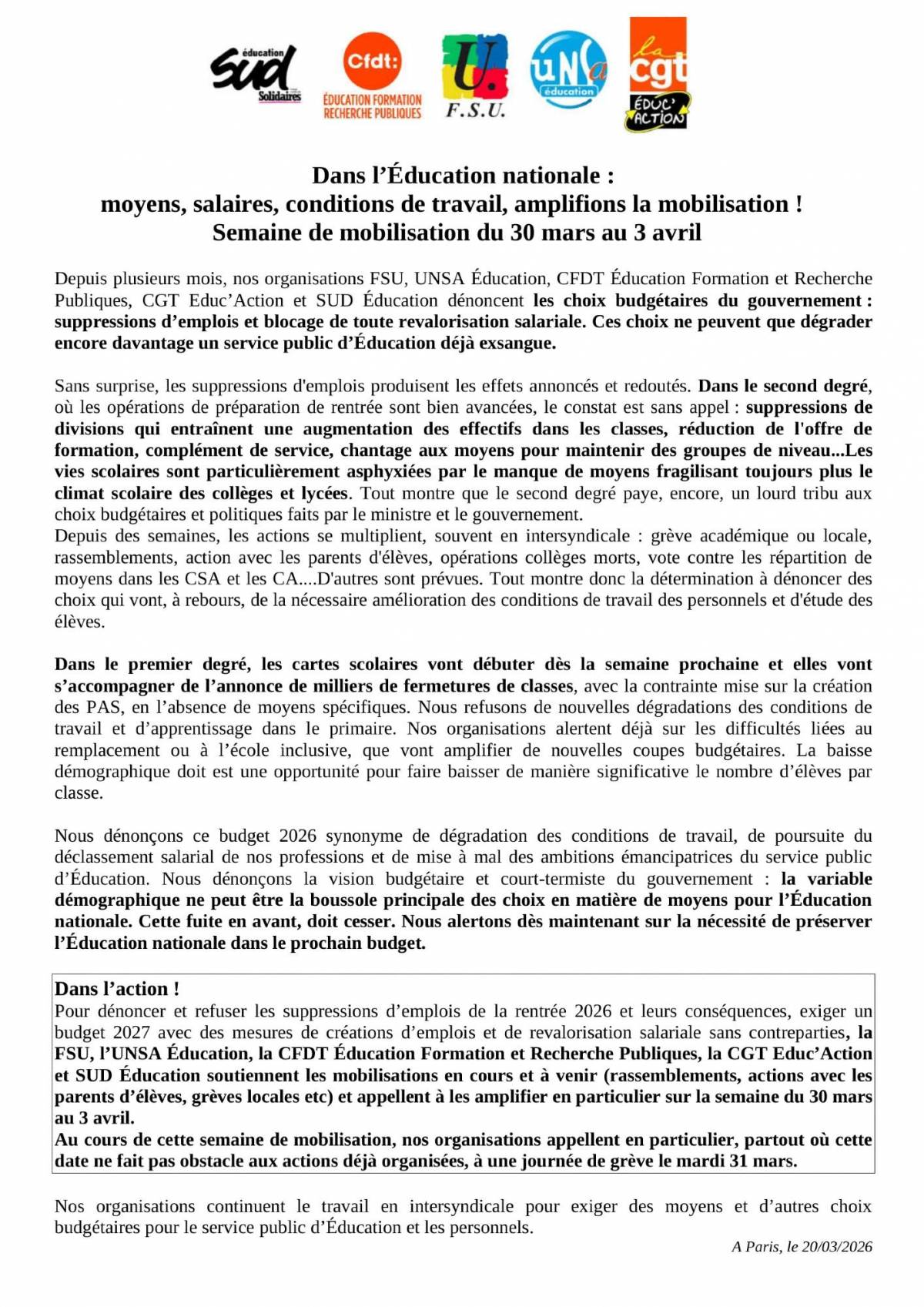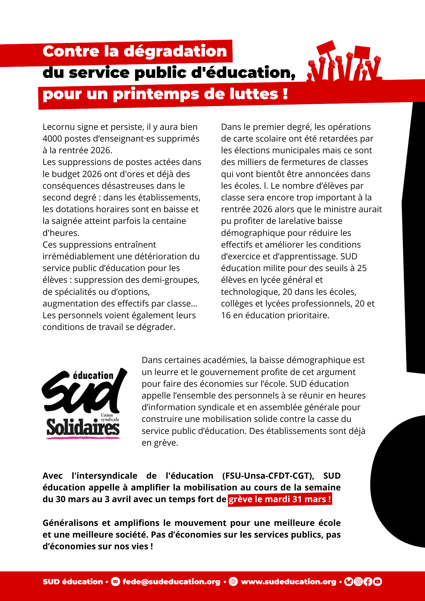 Avec l'intersyndicale de l'éducation (FSU-Unsa-CFDT-CGT), SUD éducation appelle à amplifier la mobilisation au cours de la semaine du 30 mars au 3 avril avec un temps fort de grève le mardi 31 mars !