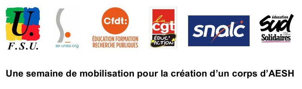 Il est temps de donner un signal fort ! C’est pourquoi l’intersyndicale FSU, SE-UNSA, CFDT Éducation Formation Recherche Publiques, CGT Éduc’action, SNALC et SUD éducation poursuit la campagne pour la création d’un corps de fonctionnaire de catégorie B pour les AESH aussi bien au niveau national qu’au plus près des lieux de travail.