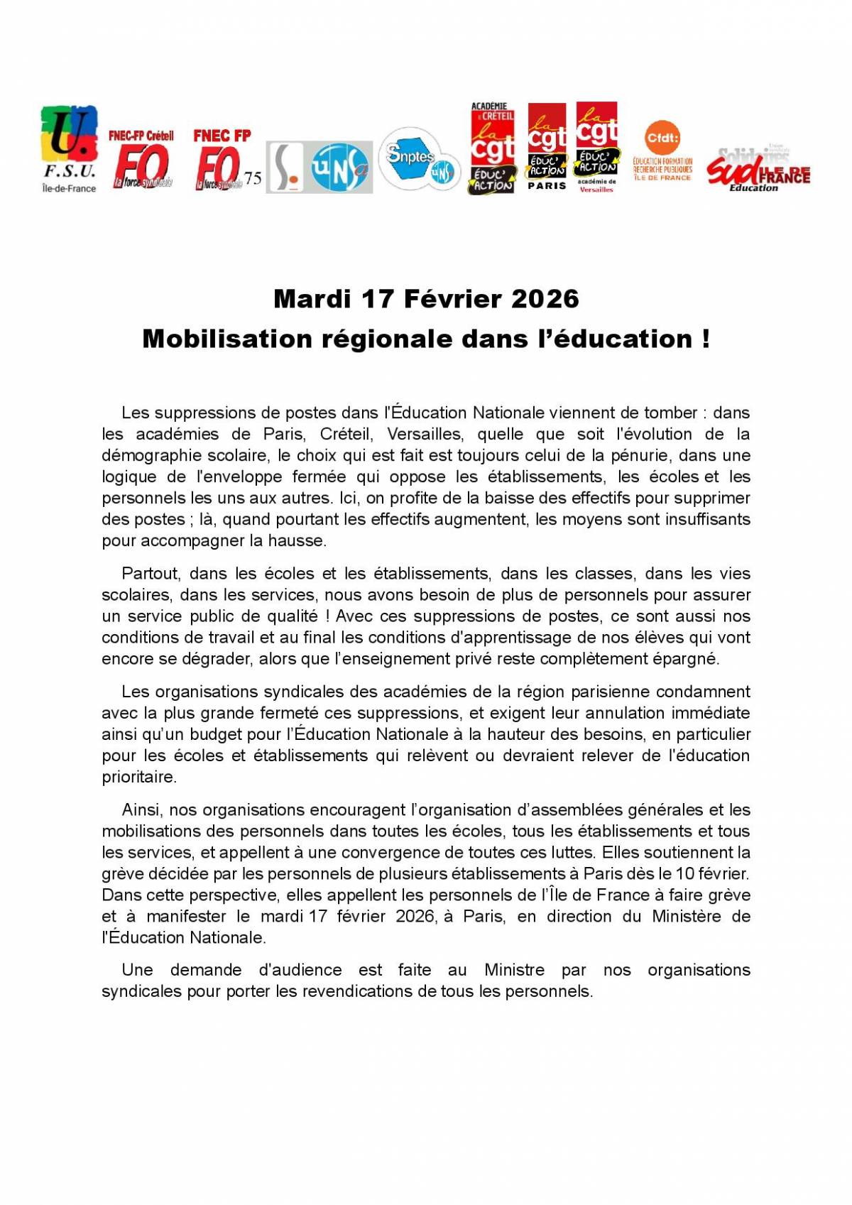 Télécharger le documentMardi 17 Février 2026 Mobilisation régionale dans l’éducation ! (format pdf)