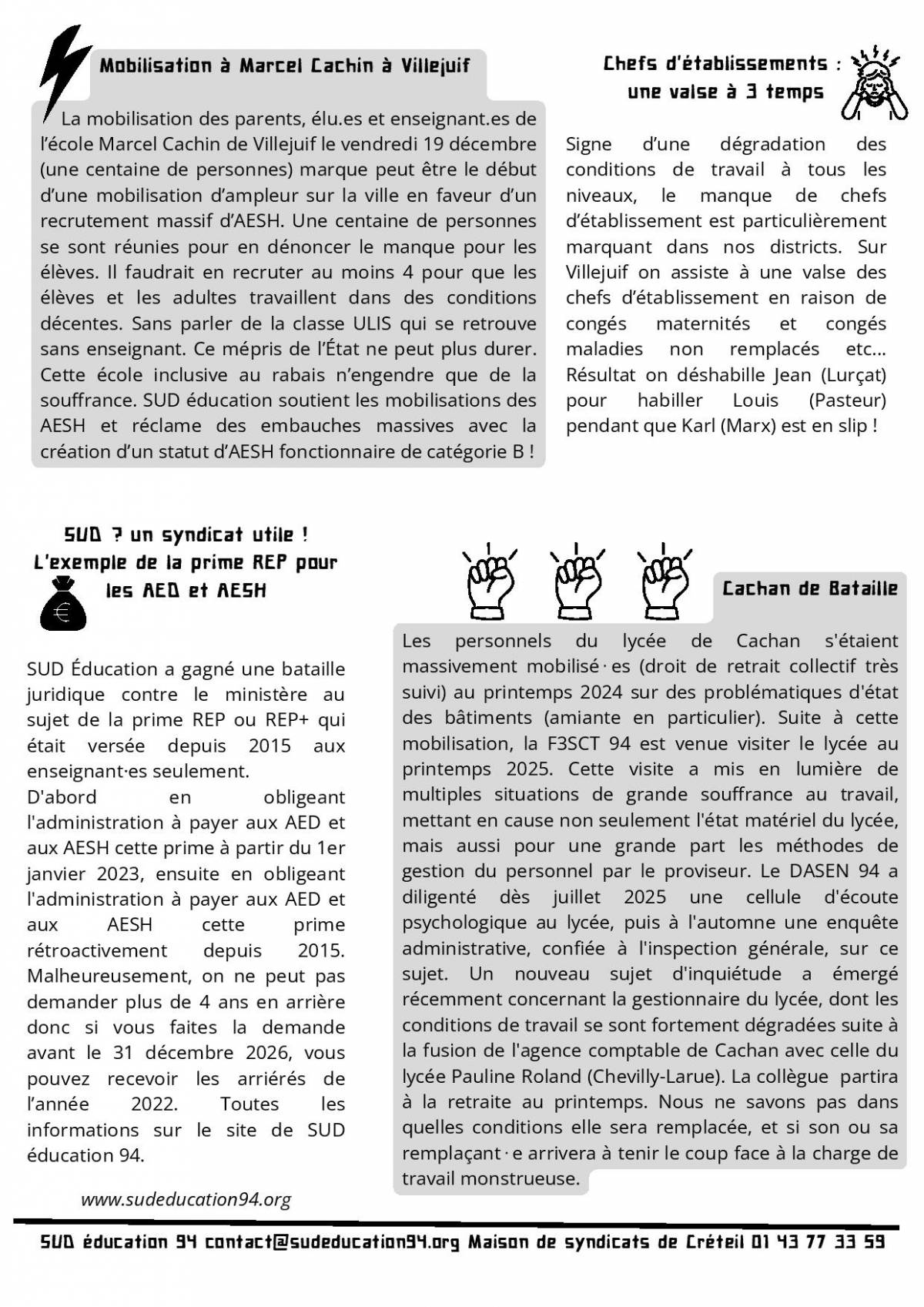 A l’appel des organisations syndicales Snudi-FO, Snuipp, Snes, CGT éduc’action et SUD éducation, plusieurs dizaines d’écoles étaient fermées (Fresnes, Vitry-sur-Seine, Champigny-sur-Marne, Thiais, Villejuif, …) et plusieurs centaines d’enseignant.es et AESH étaient en grève pour dénoncer le manque de moyens pour les élèves en situation de handicap de notre département. Cette grève a obtenu le soutien des parents d’élèves, des agents territoriaux et des enseignant.es du 2nd degré ainsi que des Unions Départementales CGT FO FSU Solidaires. Entre 400 et 500 enseignant.es et AESH se sont rassemblé.es, jeudi 15 janvier, place Bainville, à proximité du ministère de l’Éducation nationale aux cris de « Maintenant, tout de suite 3000 AESH pour le Val-de-Marne ! » « les milliards pour les AESH pas pour les porte-avions » ou encore « un vrai statut un vrai salaire ».