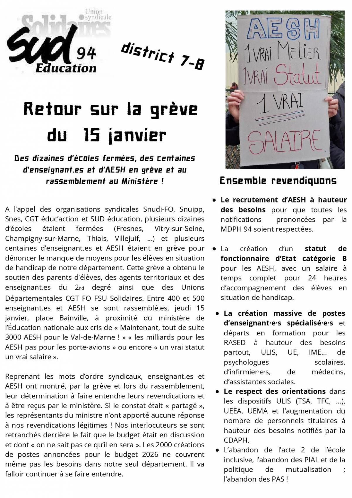 A l’appel des organisations syndicales Snudi-FO, Snuipp, Snes, CGT éduc’action et SUD éducation, plusieurs dizaines d’écoles étaient fermées (Fresnes, Vitry-sur-Seine, Champigny-sur-Marne, Thiais, Villejuif, …) et plusieurs centaines d’enseignant.es et AESH étaient en grève pour dénoncer le manque de moyens pour les élèves en situation de handicap de notre département. Cette grève a obtenu le soutien des parents d’élèves, des agents territoriaux et des enseignant.es du 2nd degré ainsi que des Unions Départementales CGT FO FSU Solidaires. Entre 400 et 500 enseignant.es et AESH se sont rassemblé.es, jeudi 15 janvier, place Bainville, à proximité du ministère de l’Éducation nationale aux cris de « Maintenant, tout de suite 3000 AESH pour le Val-de-Marne ! » « les milliards pour les AESH pas pour les porte-avions » ou encore « un vrai statut un vrai salaire ».