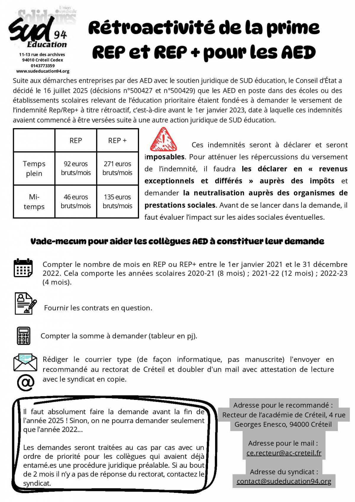 Télécharger le documentRétroactivité de la prime REP et REP + pour les AED (format pdf)